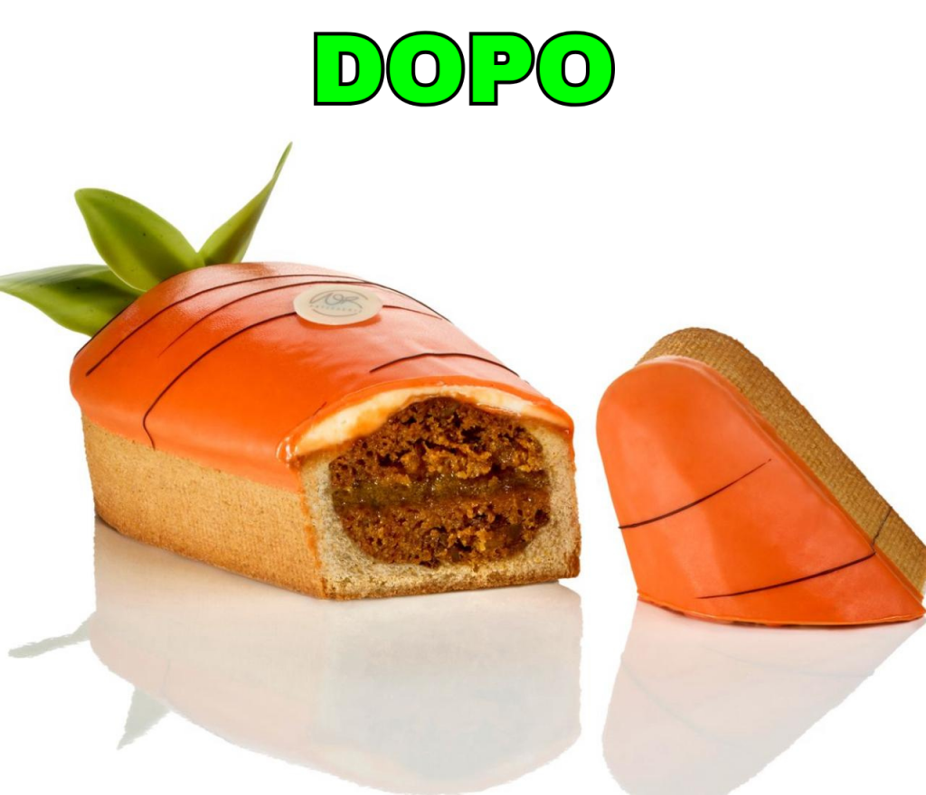 Ha tutte le caratteristiche dell’originale ma, a differenza di questa, si conserva diversi giorni a temperatura ambiente grazie a un composto a base di cream cheese appositamente bilanciato e una glassa anidra da taglio con funzione non solo decorativa, ma di protezione degli strati interni della torta.