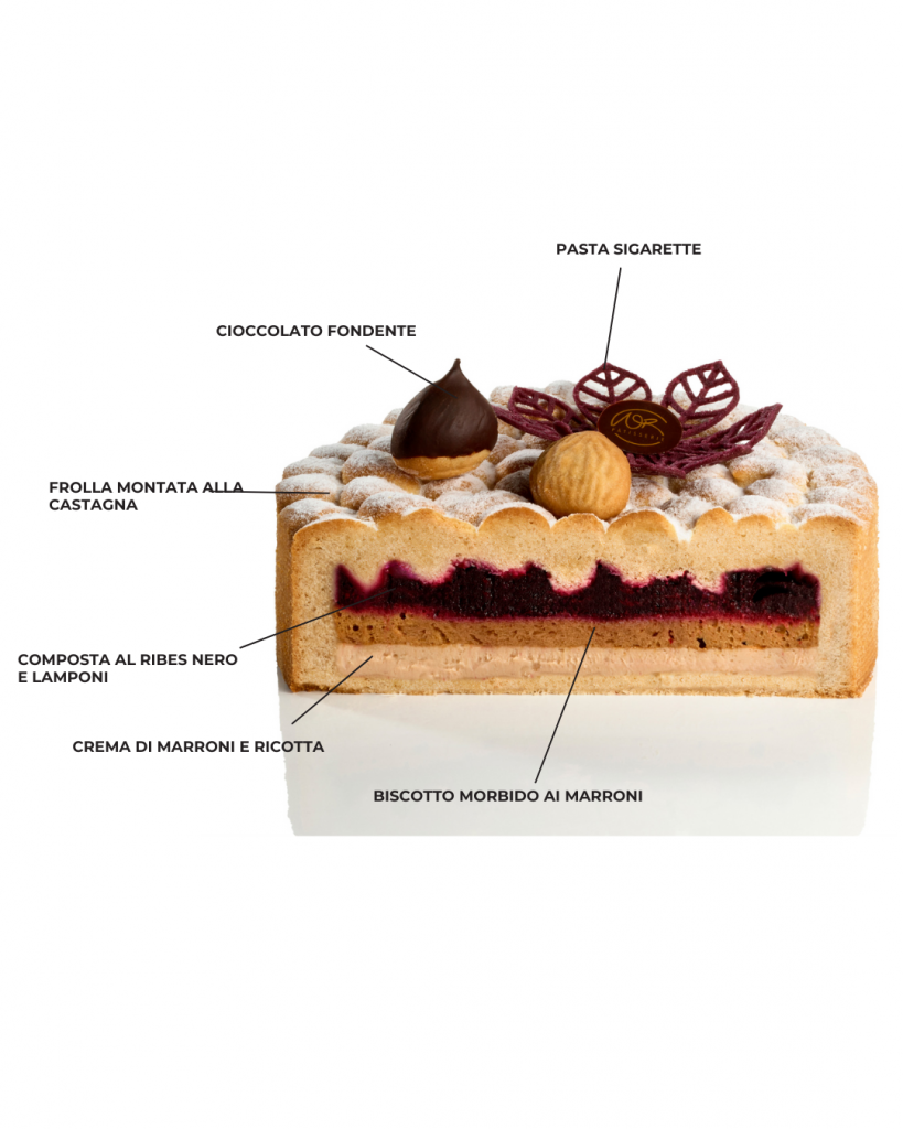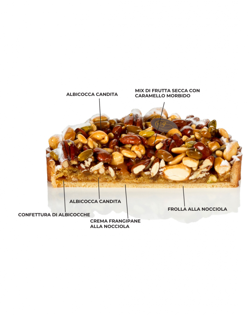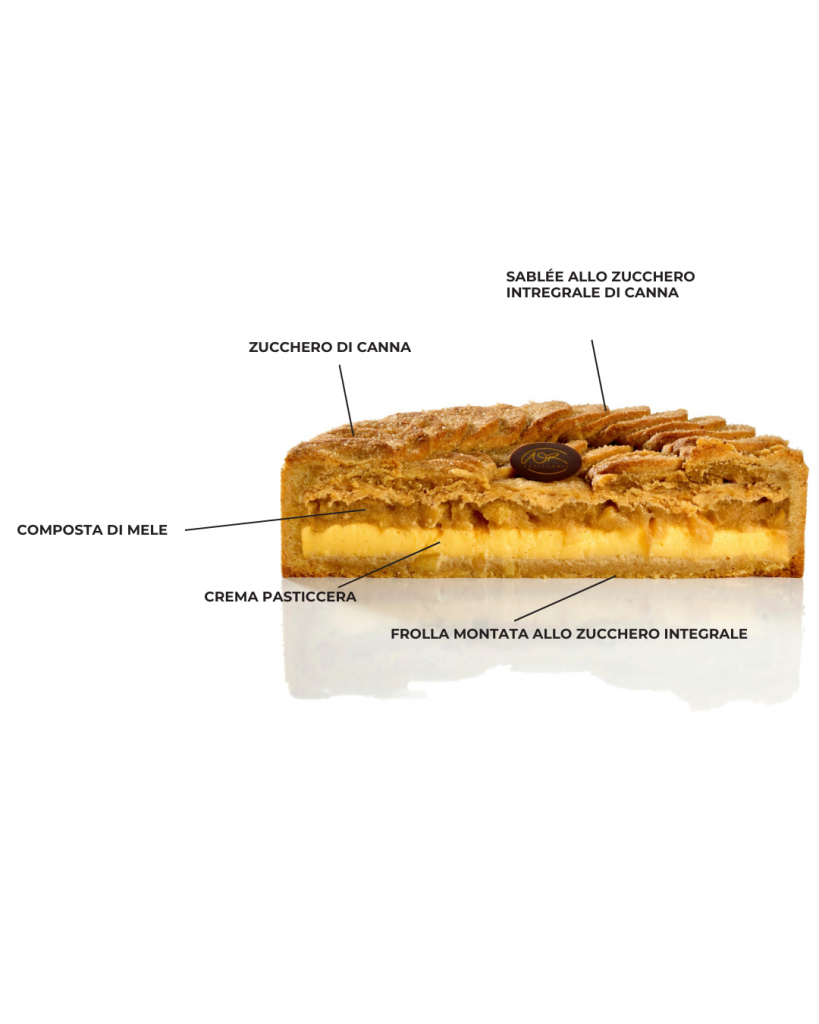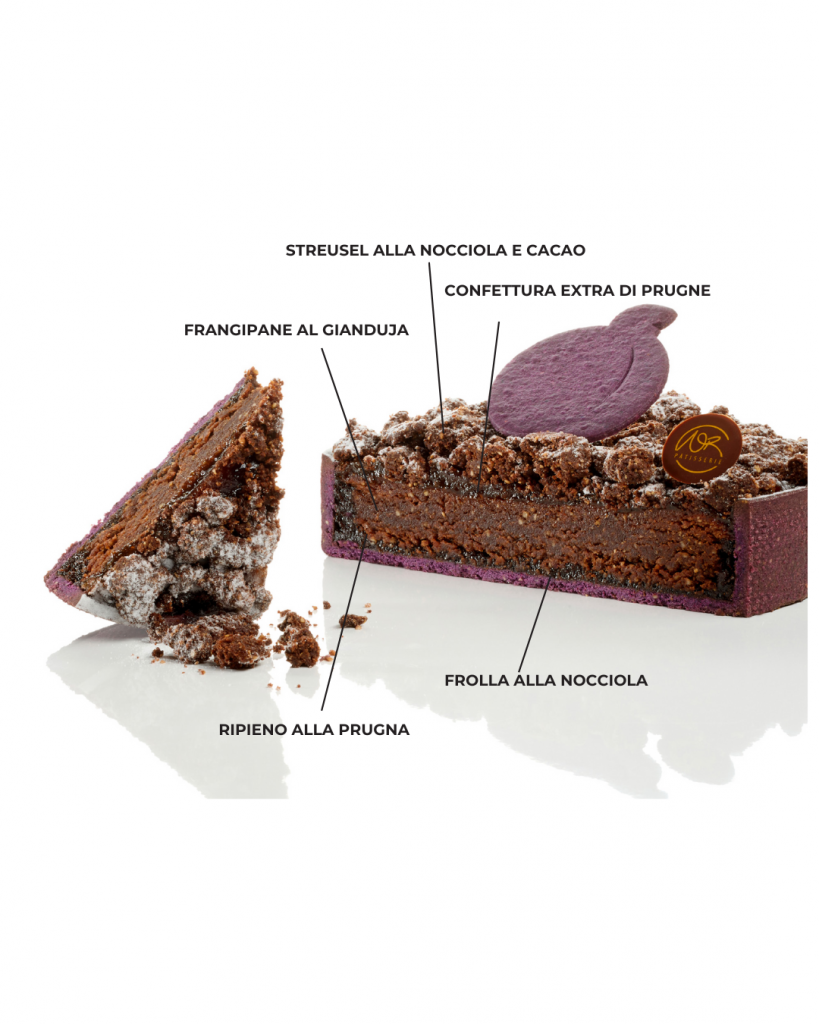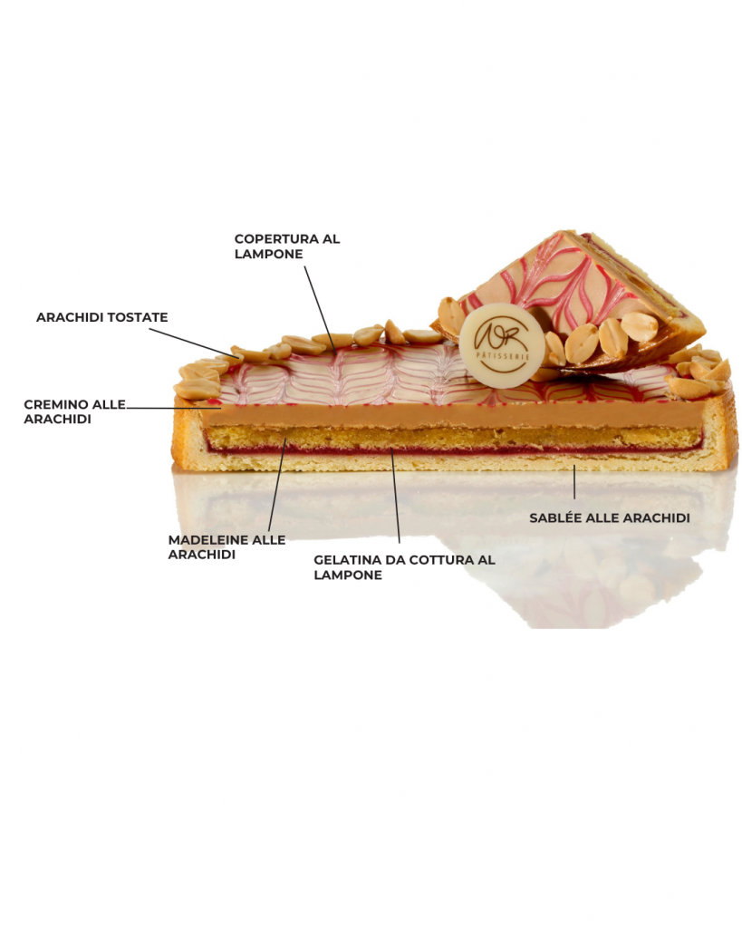 Un connubio vincente di due soli gusti declinato in diverse consistenze: la croccantezza della sablée, la masticabilità del frangipane e la setosità del cremino.